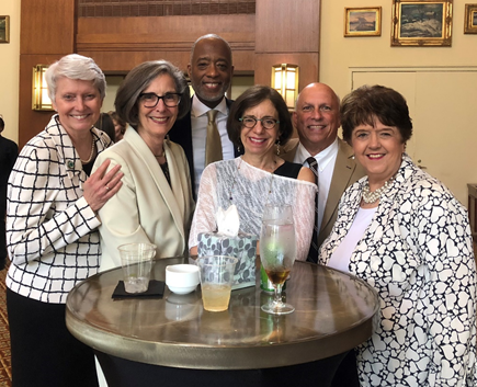 A group of six people standing together at a social event, smiling and posing for the camera with drinks on a table.